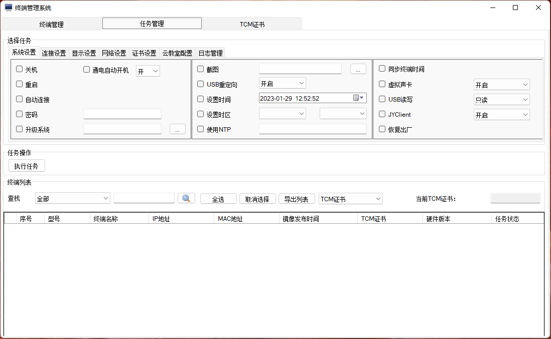 通過云終端管理系統(tǒng),勾選,關(guān)機(jī),重啟等任務(wù)之后,在終端列表里選取需要操作的終端,點(diǎn)擊執(zhí)行任務(wù)即可后臺(tái)統(tǒng)一控制。
