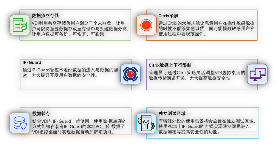 Citrix可以提供整體架構(gòu)安全加固設(shè)計(jì),從接入前,接入中,接入后多重維度來進(jìn)行安全保障,但是對(duì)于終端和云桌面數(shù)據(jù)交互部分是缺少更顆?;墓芸?。