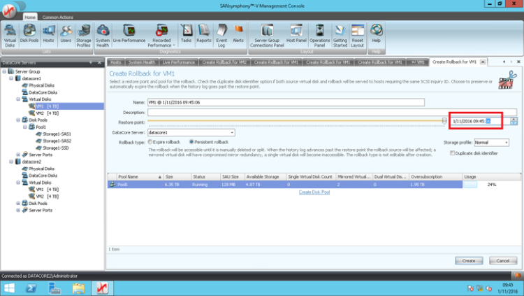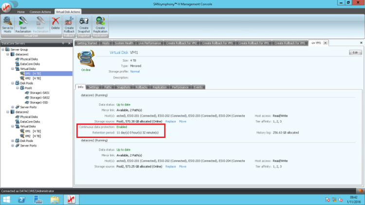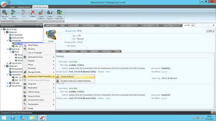 2.右鍵單擊虛擬卷,選擇Continuous data protection,選擇Creat Rollback可創(chuàng)建回滾點(diǎn)。
