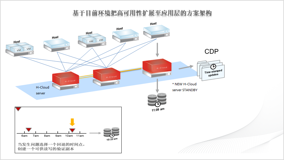 在目前環(huán)境中增加一臺(tái)實(shí)時(shí)備份服務(wù)器,啟動(dòng)CDP技術(shù),CDP技術(shù)優(yōu)于傳統(tǒng)備份主要特點(diǎn)之一就是時(shí)間窗口更加綿密。