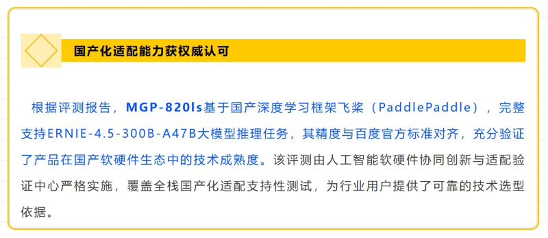 根據(jù)評測報告,MGP-820ls基于國產(chǎn)深度學習框架飛槳(PaddlePaddle),完整支持ERNIE-4.5-300B-A47B大模型推理任務,其精度與百度官方標準對齊,充分驗證了產(chǎn)品在國產(chǎn)軟硬件生態(tài)中的技術(shù)成熟度。該評測由人工智能軟硬件協(xié)同創(chuàng)新與適配驗證中心嚴格實施,覆蓋全棧國產(chǎn)化適配支持性測試,為行業(yè)用戶提供了可靠的技術(shù)選型依據(jù)。