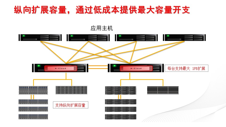 應(yīng)用服務(wù)器與存儲(chǔ)節(jié)點(diǎn)數(shù)據(jù)交互,是通過(guò)部署后的 H-Cloud 系統(tǒng)來(lái)實(shí)現(xiàn)的,擺脫了原來(lái)基于控制器的訪問(wèn),而依靠高速緩沖去建立的聚合寫入,緩存預(yù)讀服務(wù),可以提高I/O最大的訪問(wèn)效率;高速緩沖性能依靠 H-Cloud Server 物理內(nèi)存來(lái)實(shí)現(xiàn)的,可以根據(jù)用戶需要進(jìn)行實(shí)際的擴(kuò)充,而原有的控制器僅需要維持基本運(yùn)行便可;