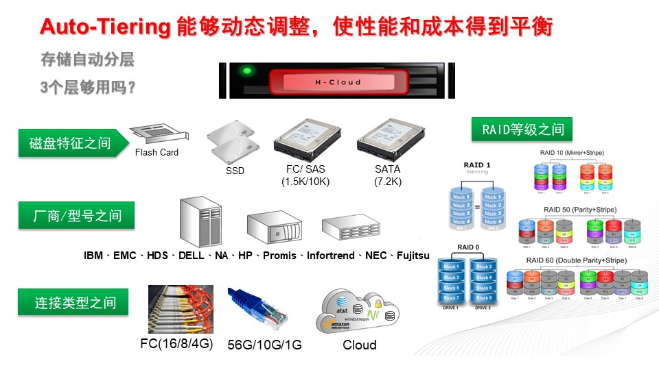 自動(dòng)存儲(chǔ)分層:通過(guò)監(jiān)測(cè)I / O訪問(wèn),確定其使用的頻率,然后動(dòng)態(tài)信息塊移動(dòng)到最合適的類或存儲(chǔ)設(shè)備層。 H-Cloud 系統(tǒng)會(huì)自動(dòng)“尋找”最常用的塊,和最快的層,而最不常用的塊“降級(jí)”到最慢層。只有當(dāng)該層完全耗盡,將一個(gè)下層選擇。
