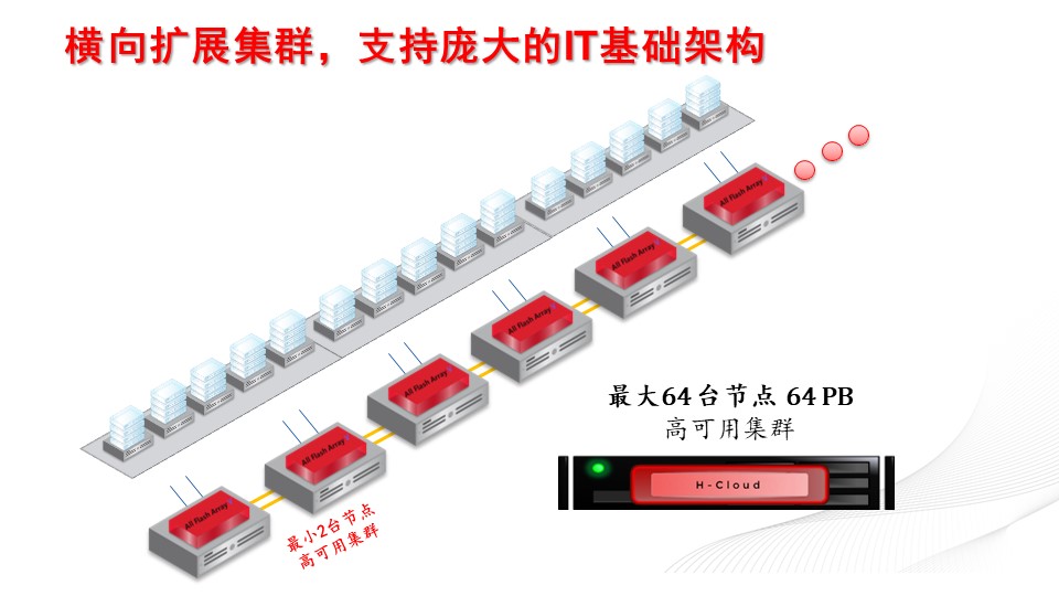 彈性架構(gòu): H-Cloud 先進(jìn)的虛擬技術(shù)為存儲(chǔ)資源無(wú)縫擴(kuò)展提供了可行性。靈活的擴(kuò)展性為 IT 系統(tǒng)打下堅(jiān)實(shí)的基礎(chǔ)。